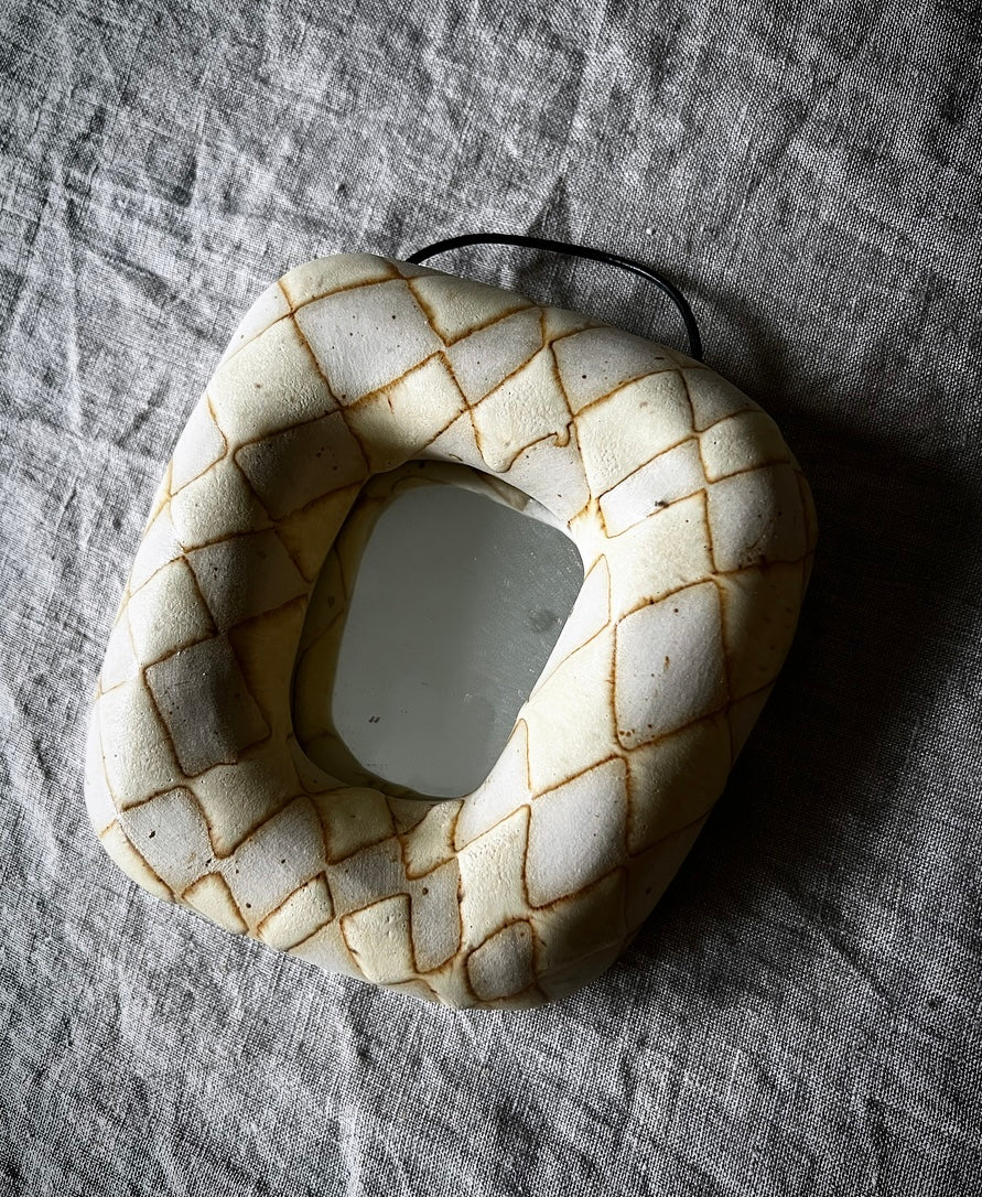 Liten tjock spegel i stengodslera med rutig dekor av beige glasyr