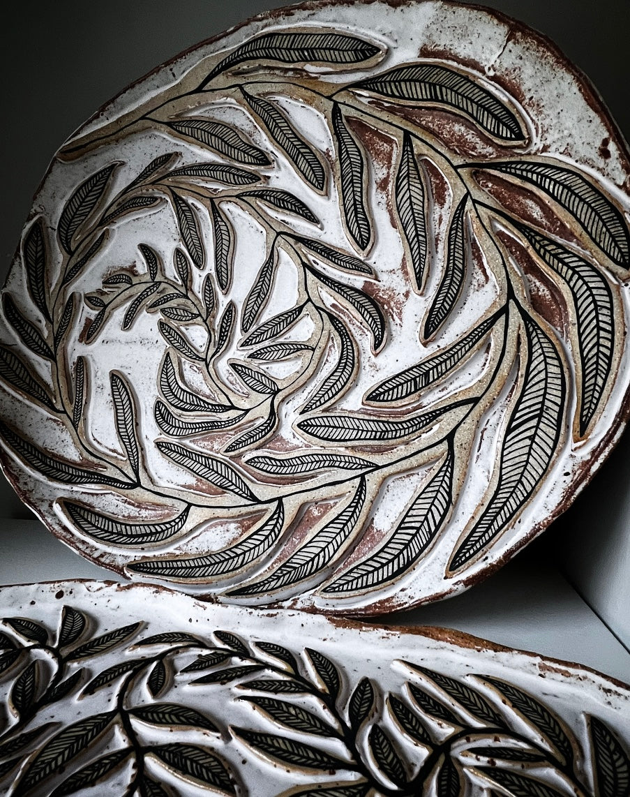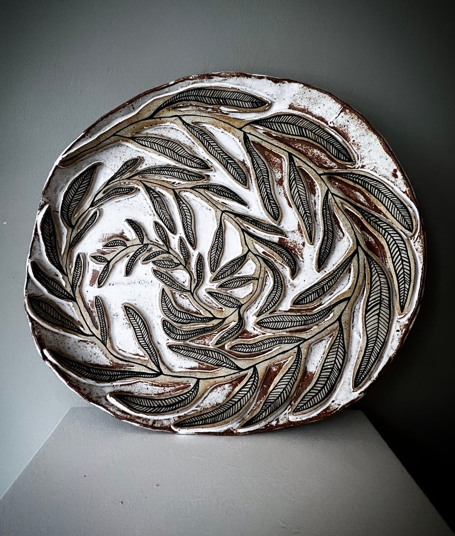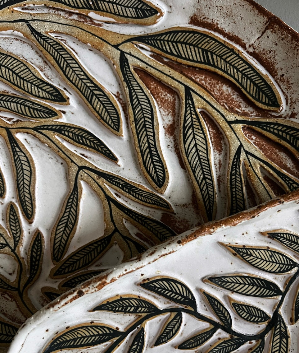 Rustik fat i grov stengodslera med relief & handmålade blad. Vit glasyr.
