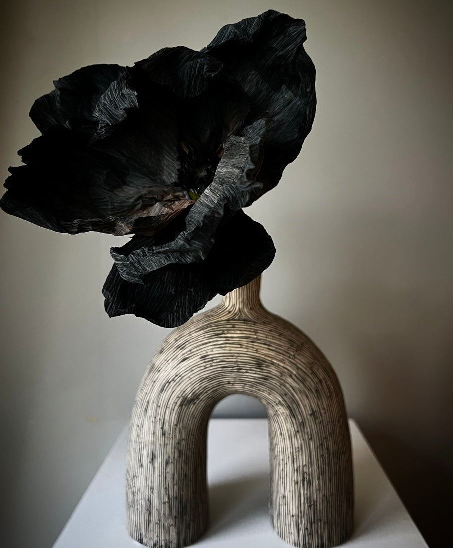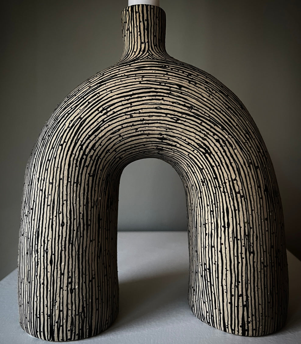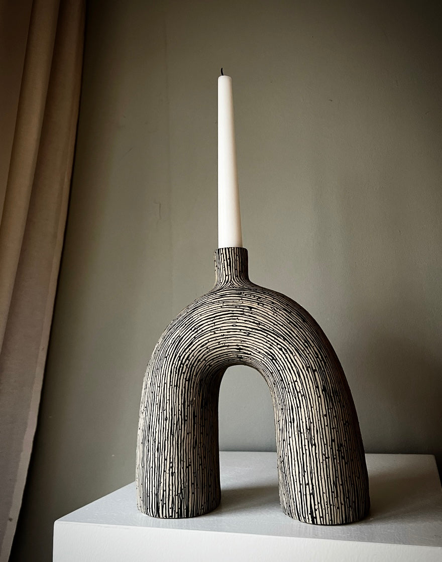 Ljusstake/vas i stengodslera. Glaserad insida, handmålad dekor