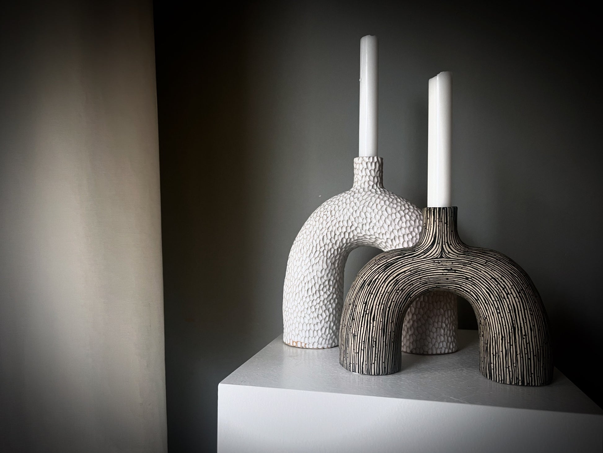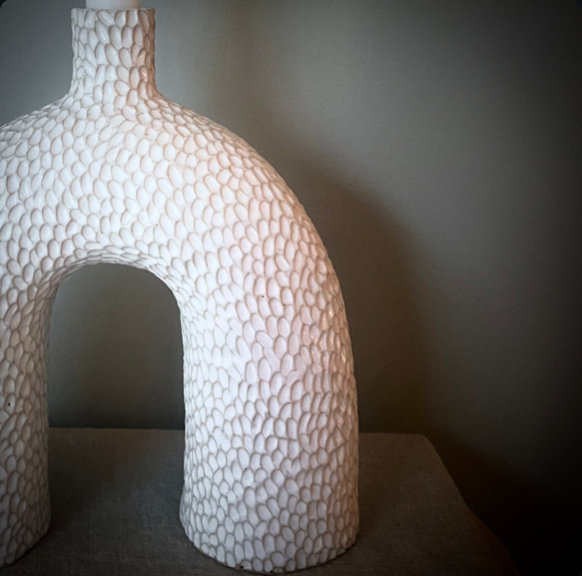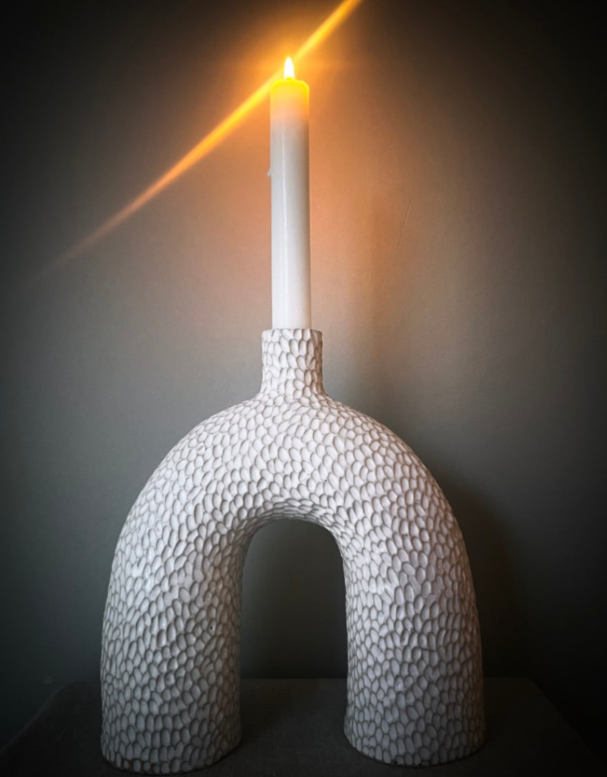 Vas/ljusstake i en levande stengodslera med lavafläckar. Gropig struktur, vit sidenmatt glasyr.