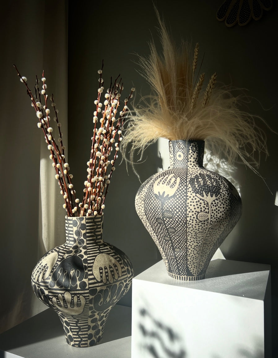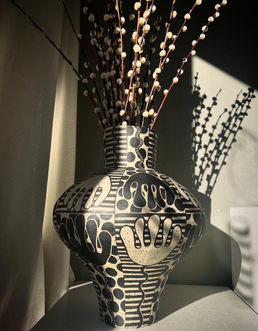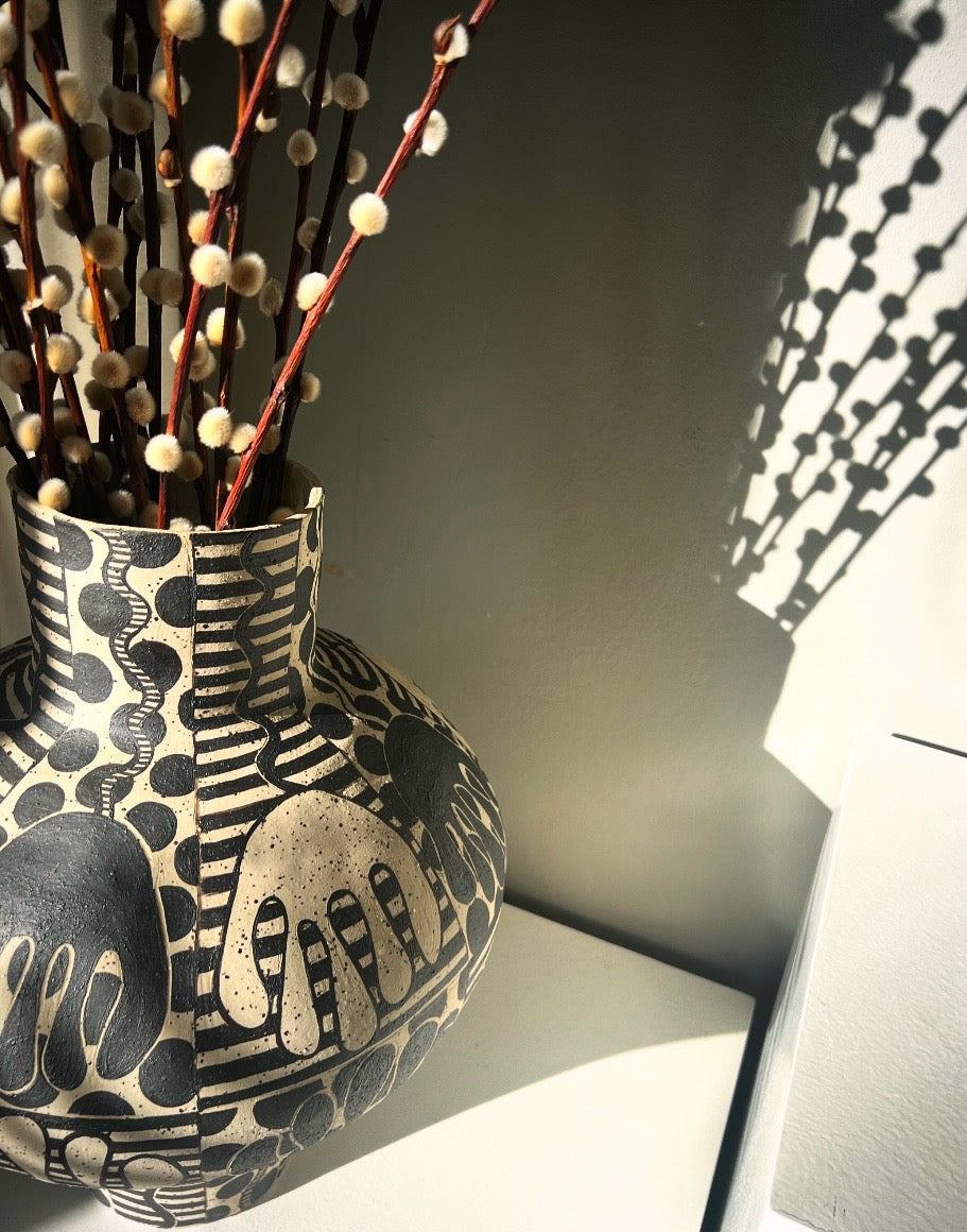 Urna, byggd för hand i prickig ljus stengodslera, handmålad.