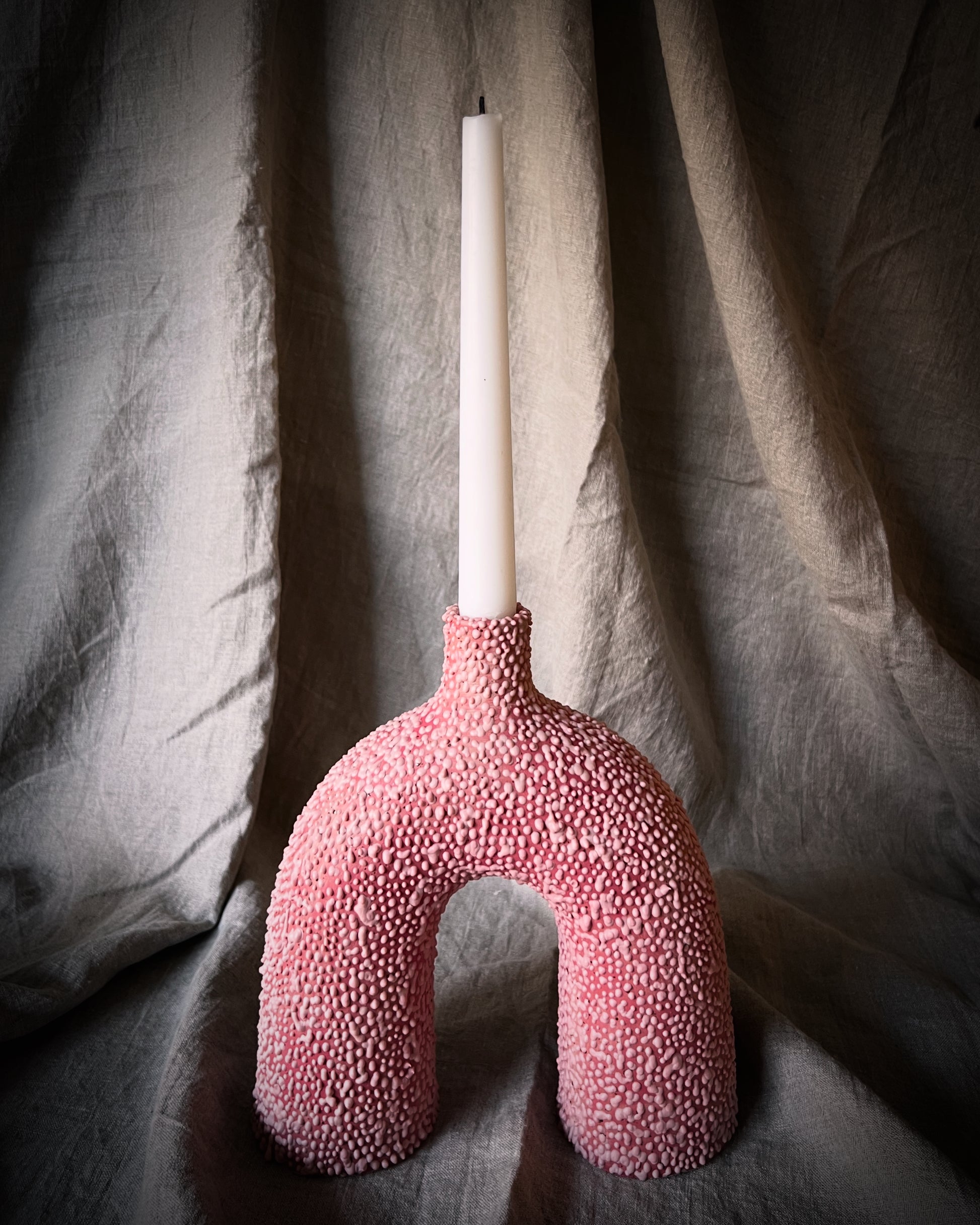 Vas/Ljusstake i stengodslera, överdragen med infärgat porslin i varm rosa, knottrig yta, glaserad insida. Ca 24 cm hög