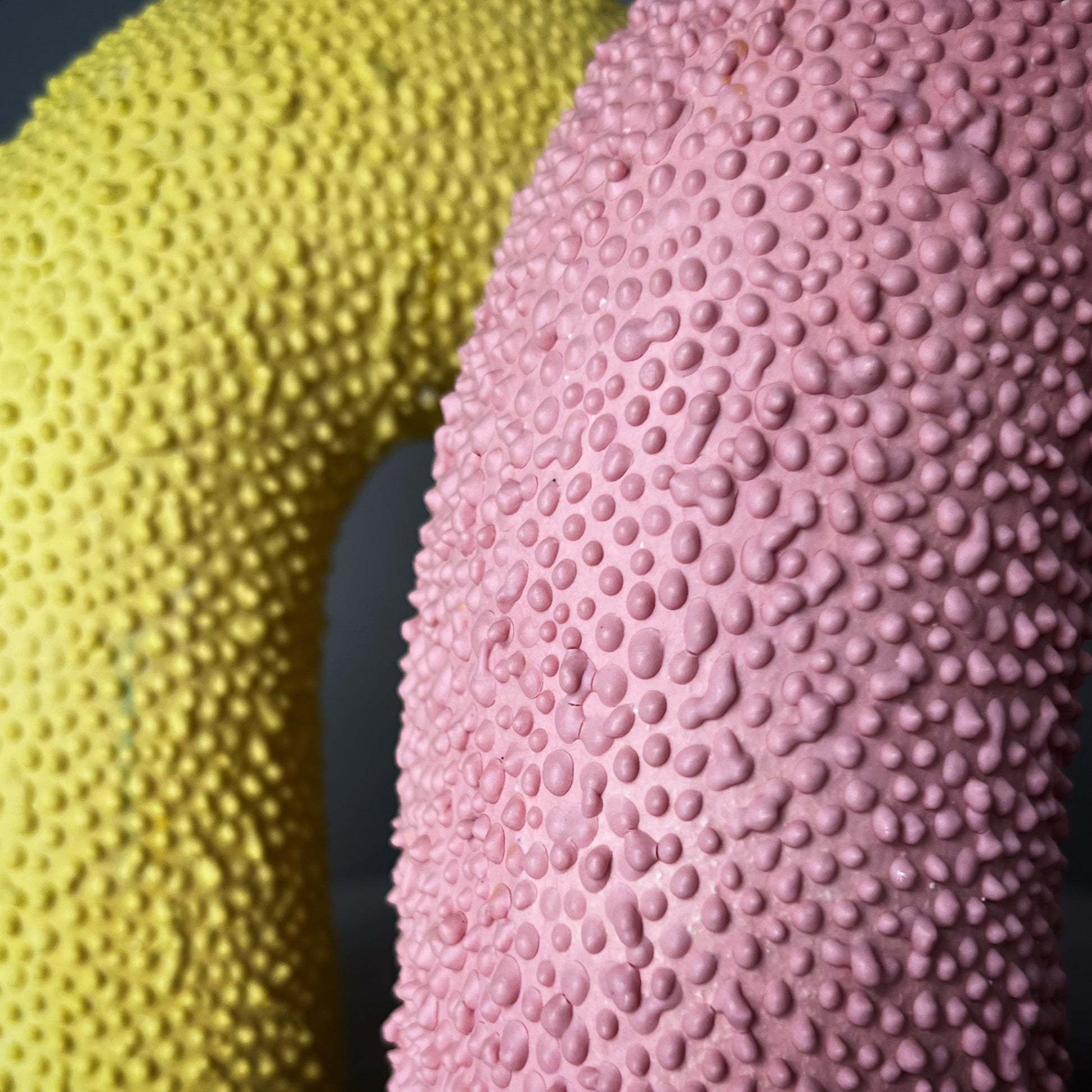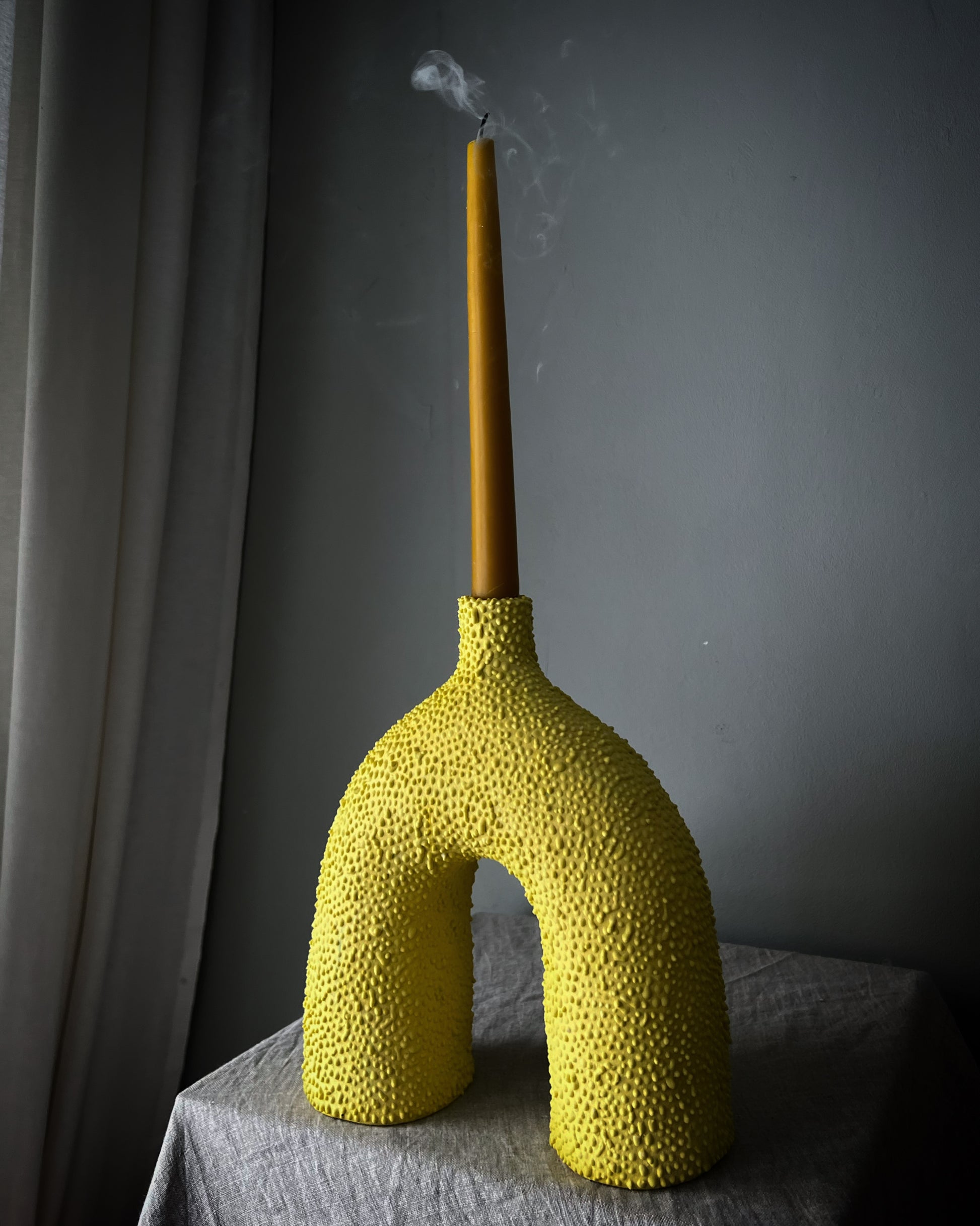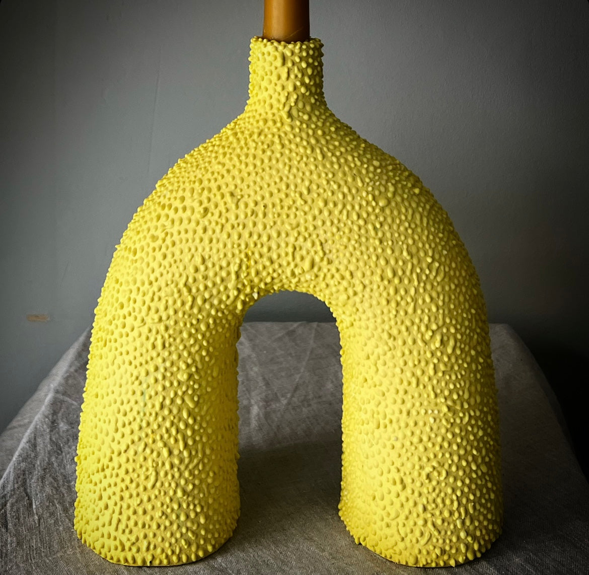Vas/Ljusstake i stengodslera, överdragen med infärgat porslin i intensiv solgul, knottrig yta, glaserad insida. Ca 24 cm hög