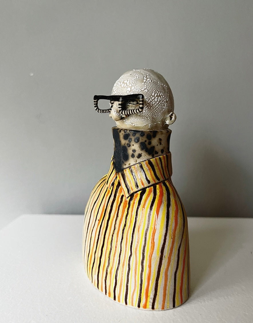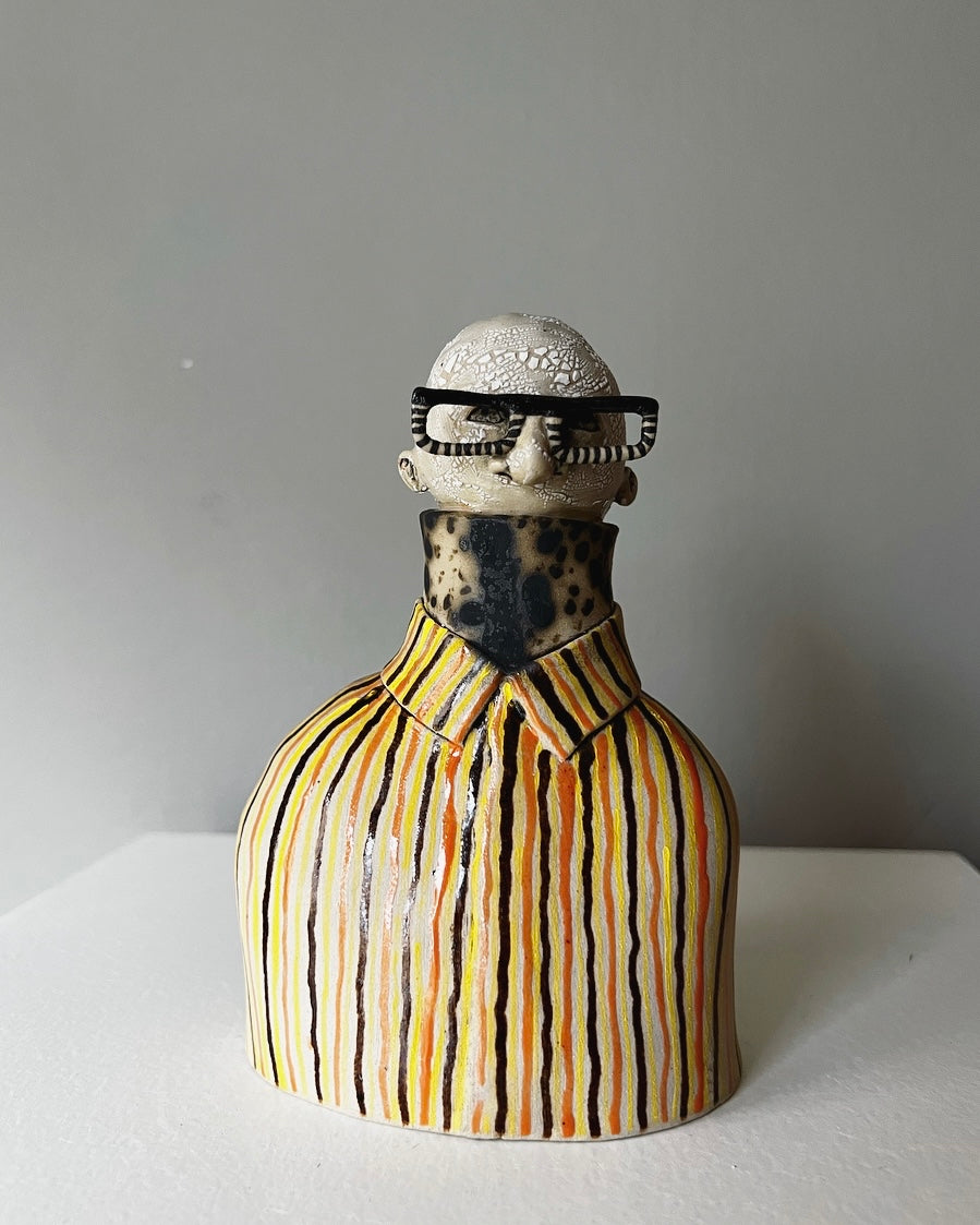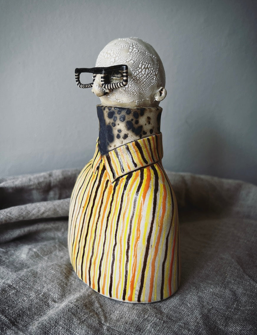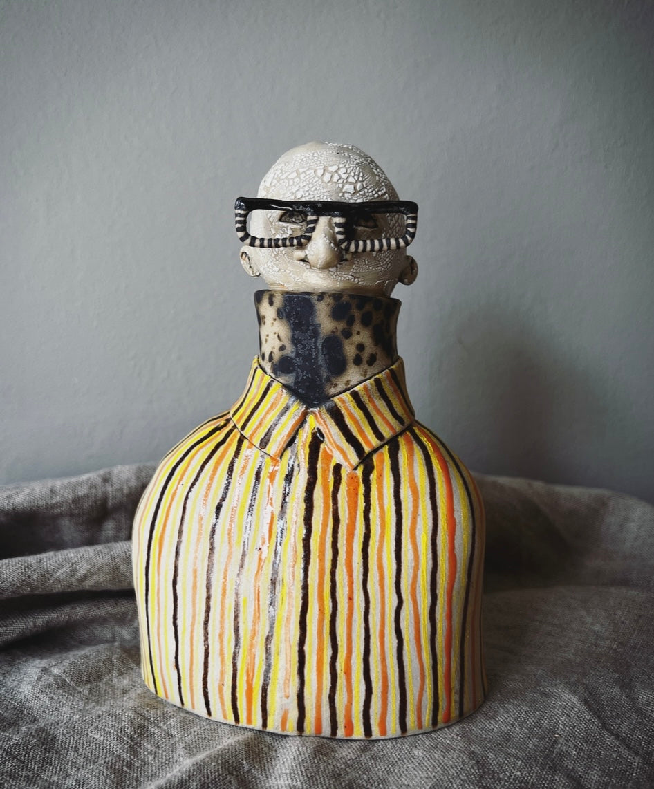 Svante bär kantiga glasögon med delvis randigt mönster, till det en brunflammig polo under en klassisk marimekkoskjorta i brunt, gult & orange.