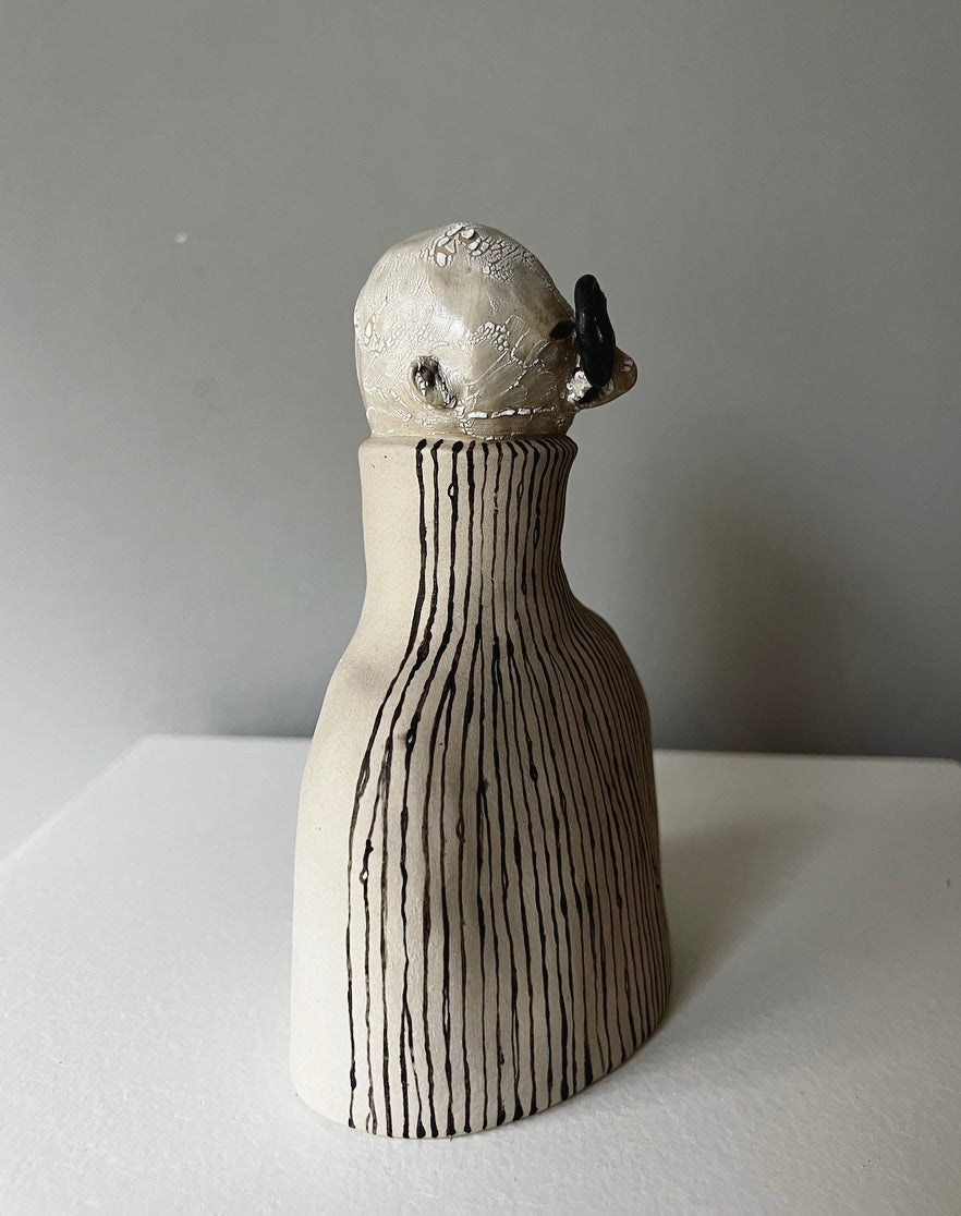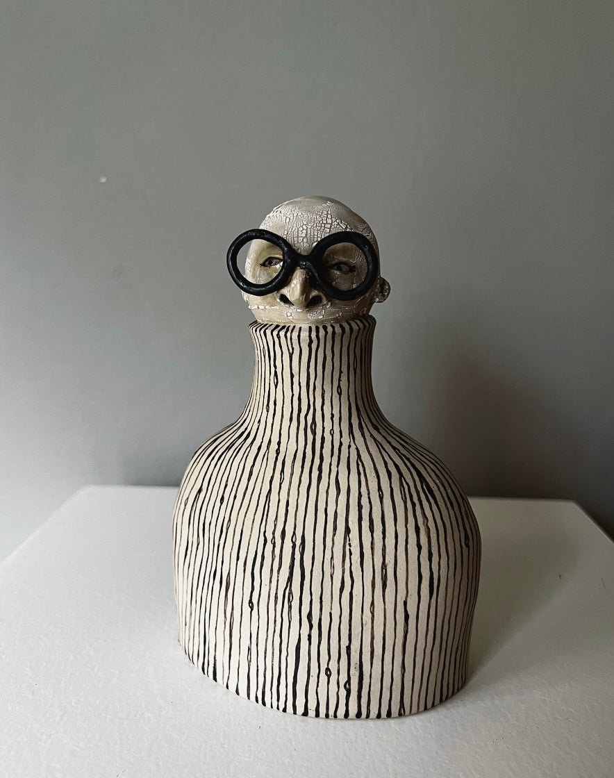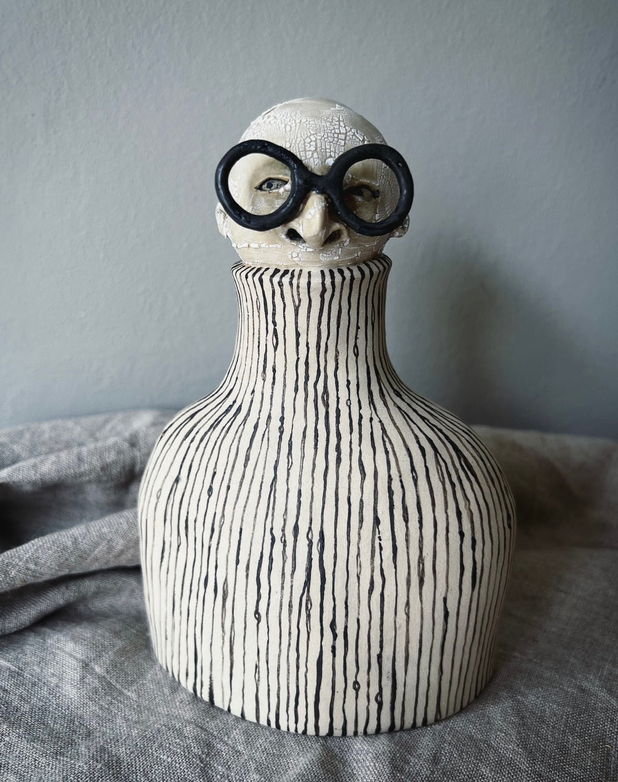 Jon har stora runda brillor, kolsvarta, samma färg som de tunna linjerna på tröjan.