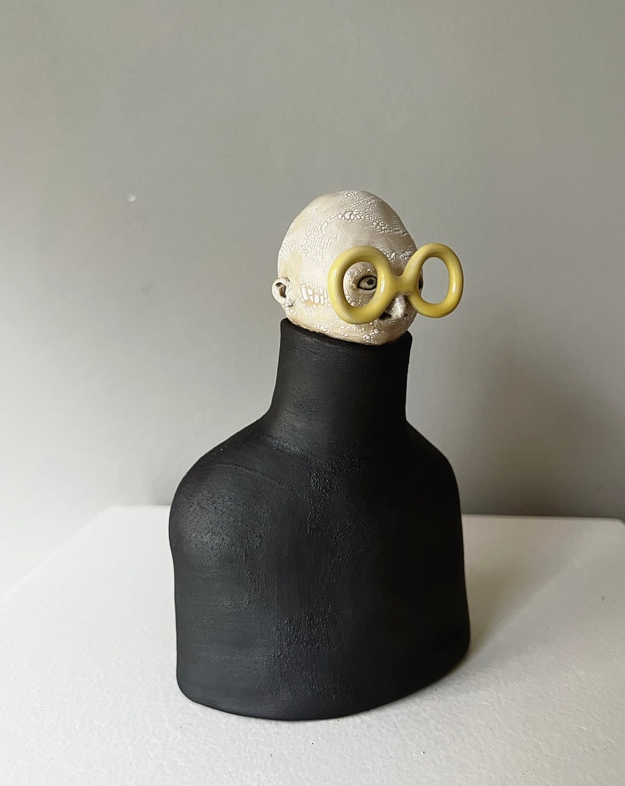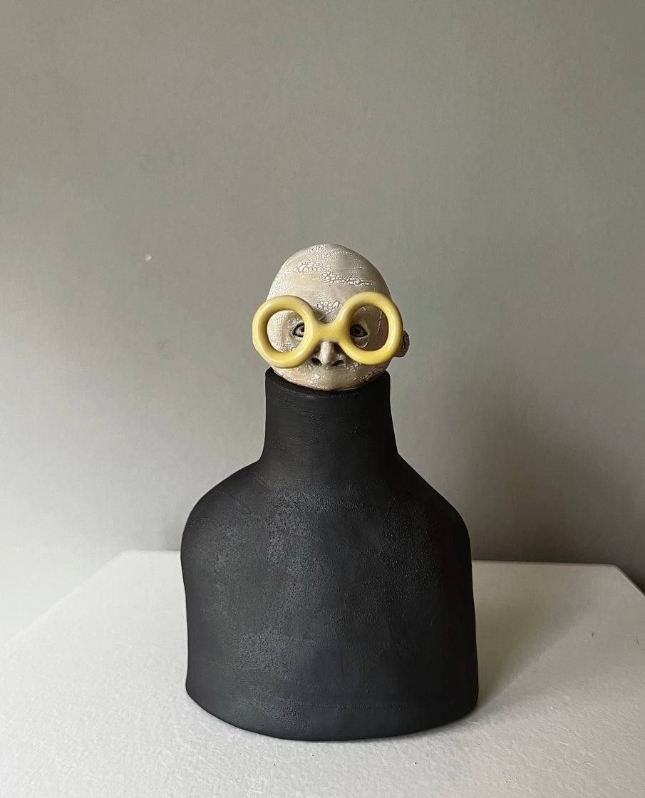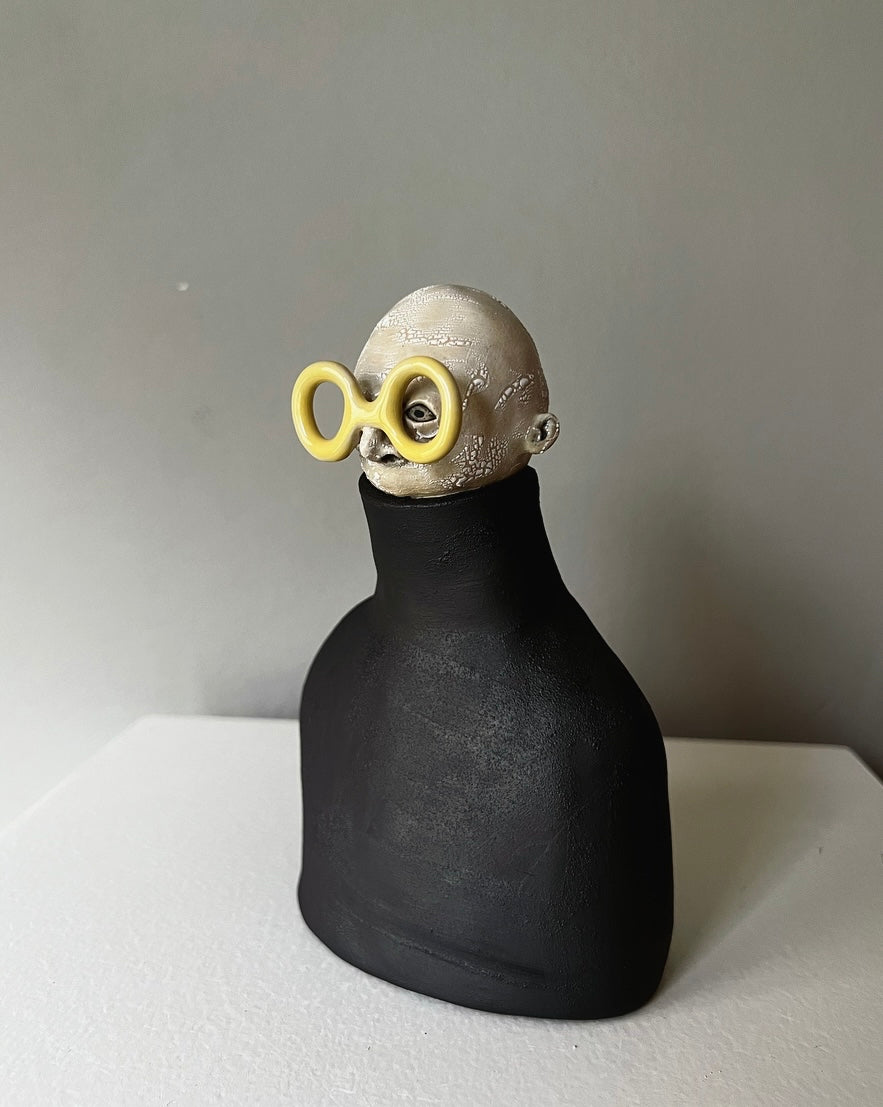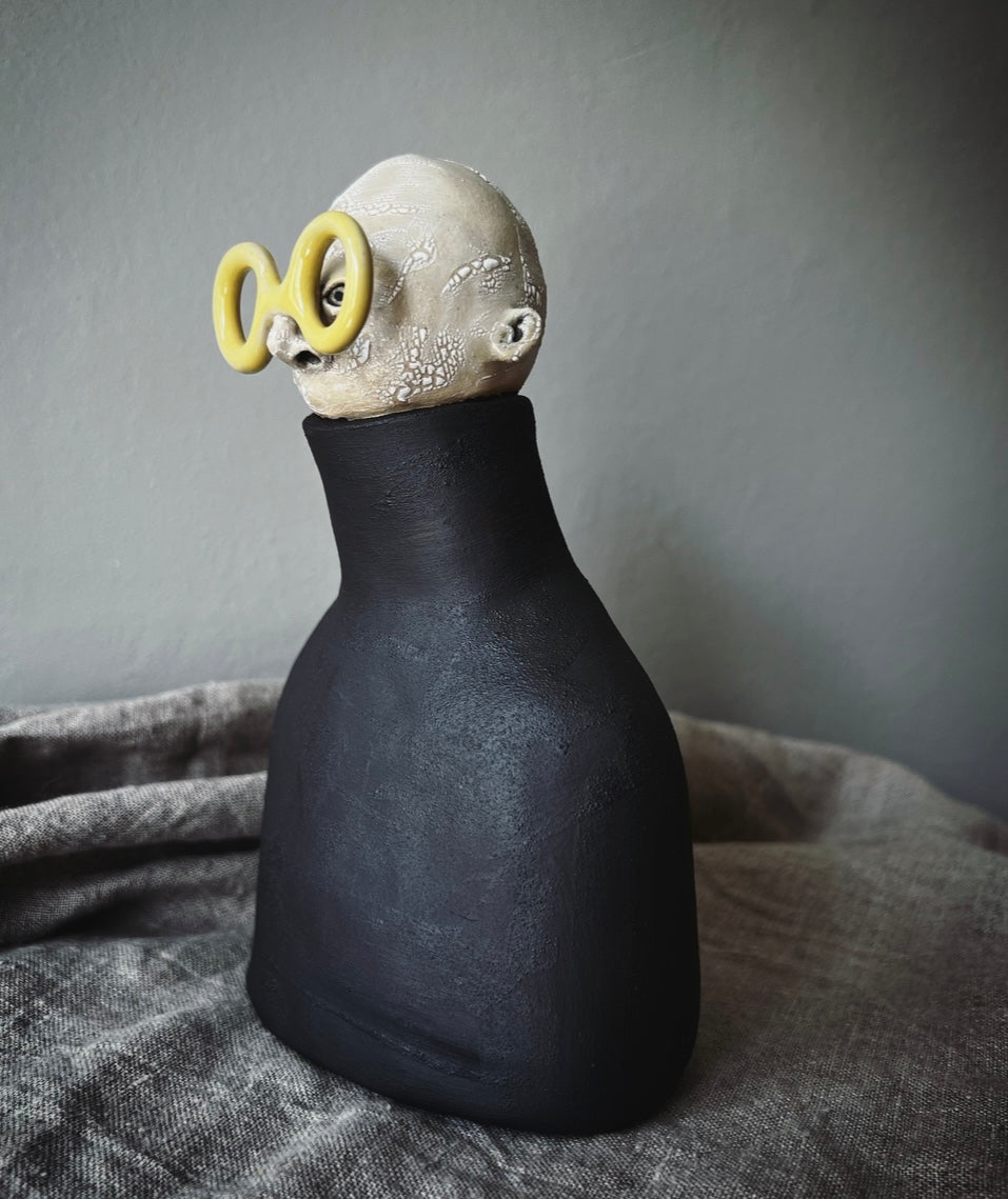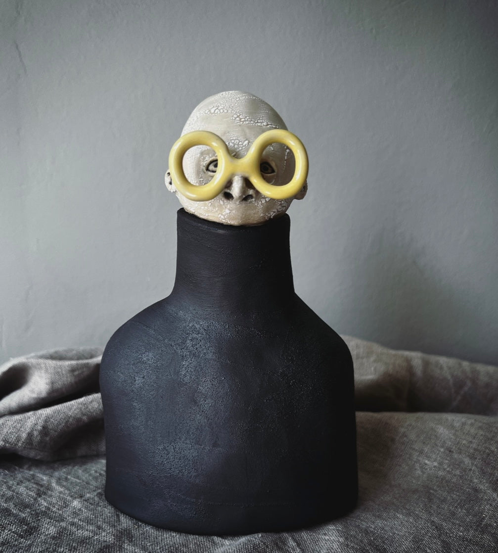 Love har en svart matt polo & tjocka, runda, glasögon i blank citrongul.