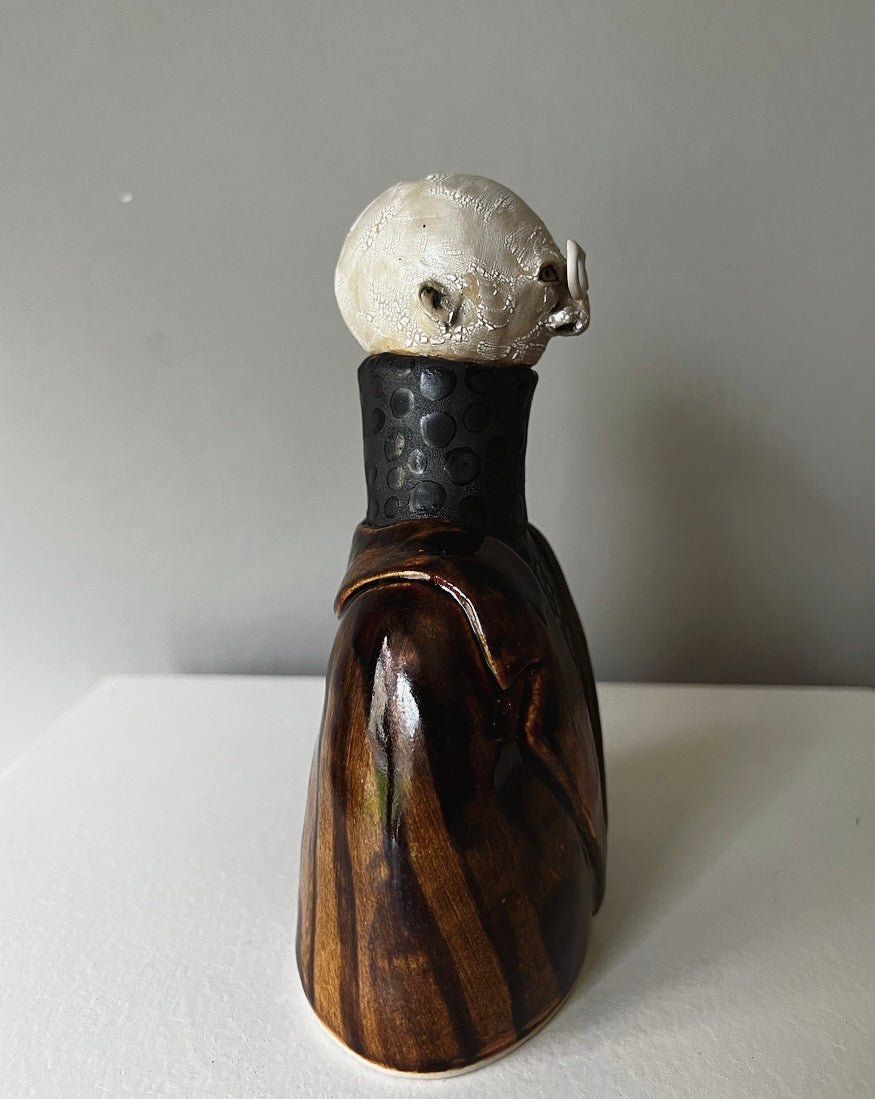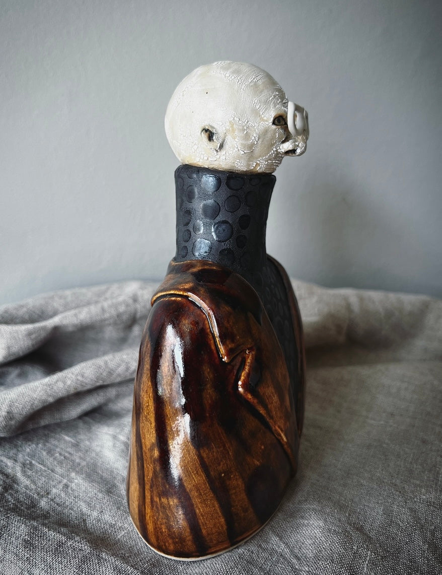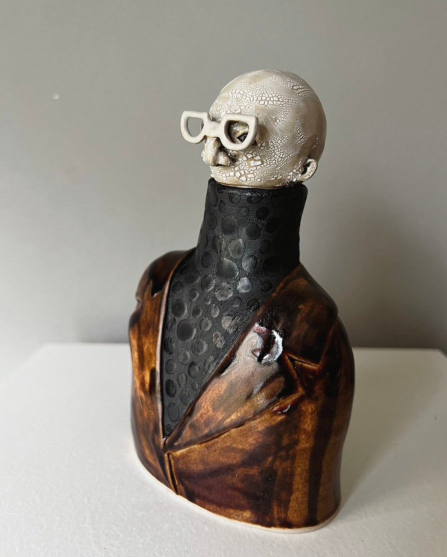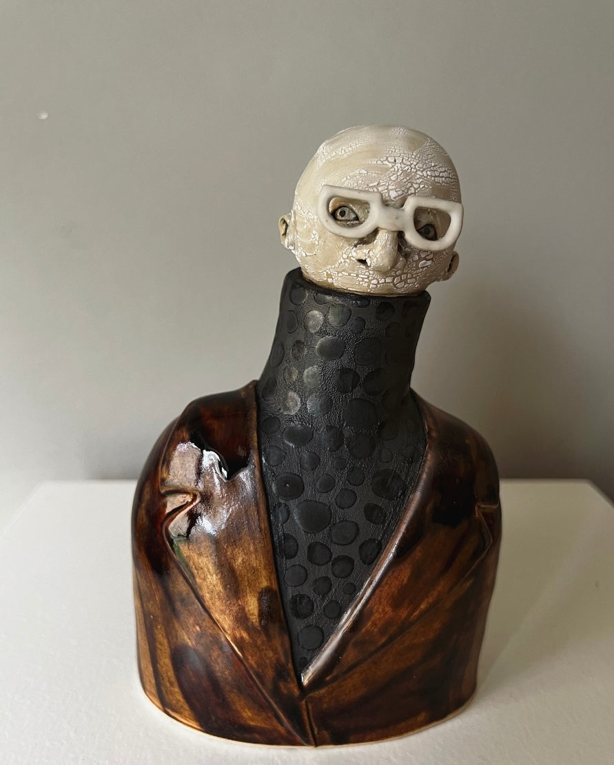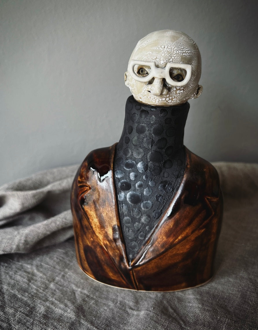 Wilhelm är klädd i blank brun kavaj & svart polo med subtilt prickigt mönster, glasögonen är sidenmatta i vitt.