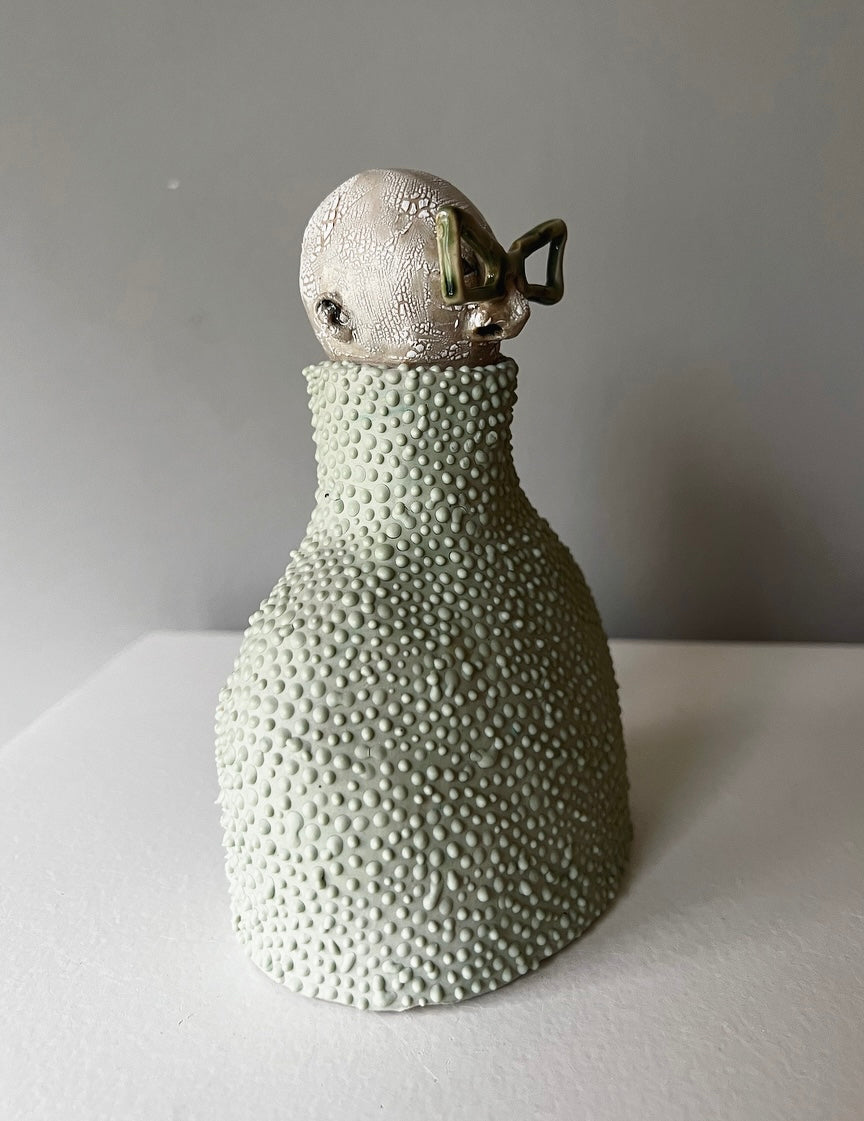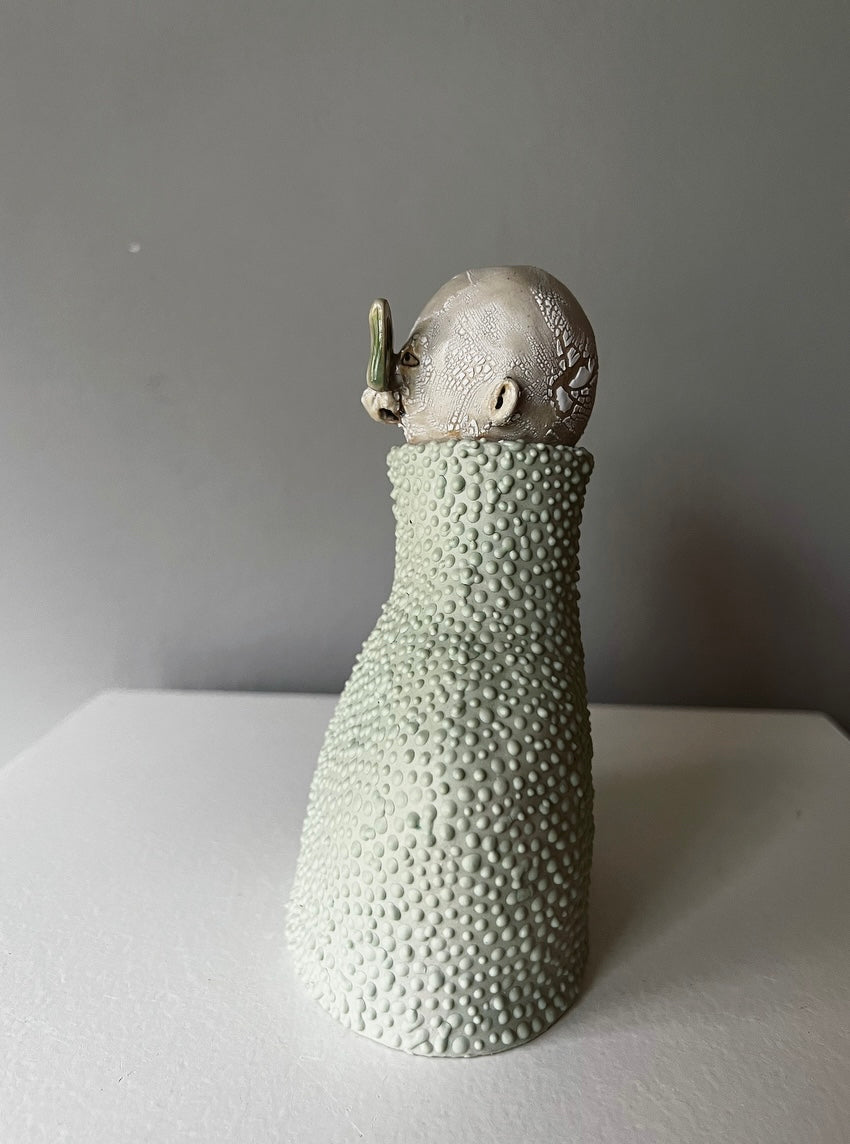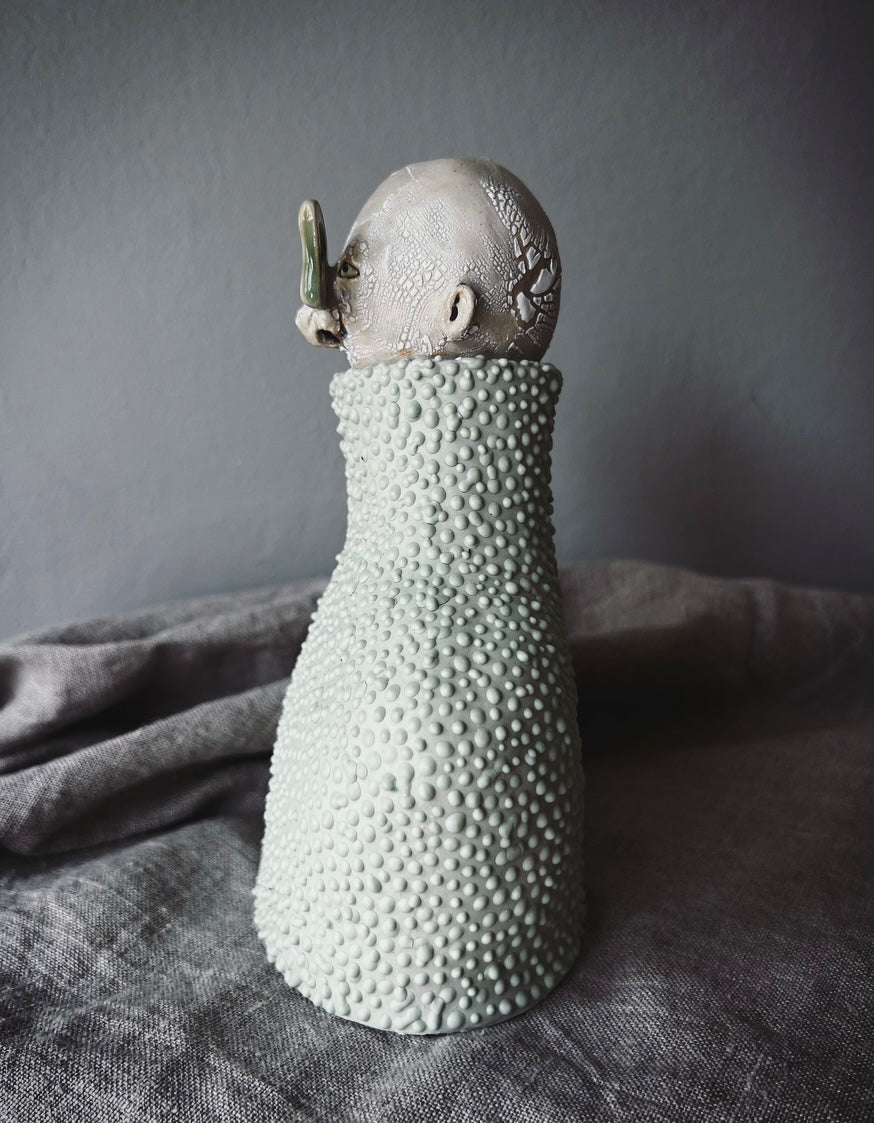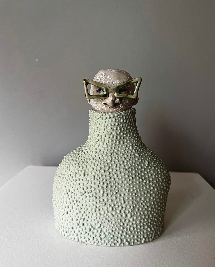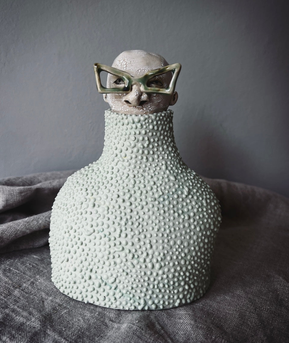 Sverir är iklädd pistagegrön polo i knottrig struktur & kattglasögon i melerad koppargrönt.
