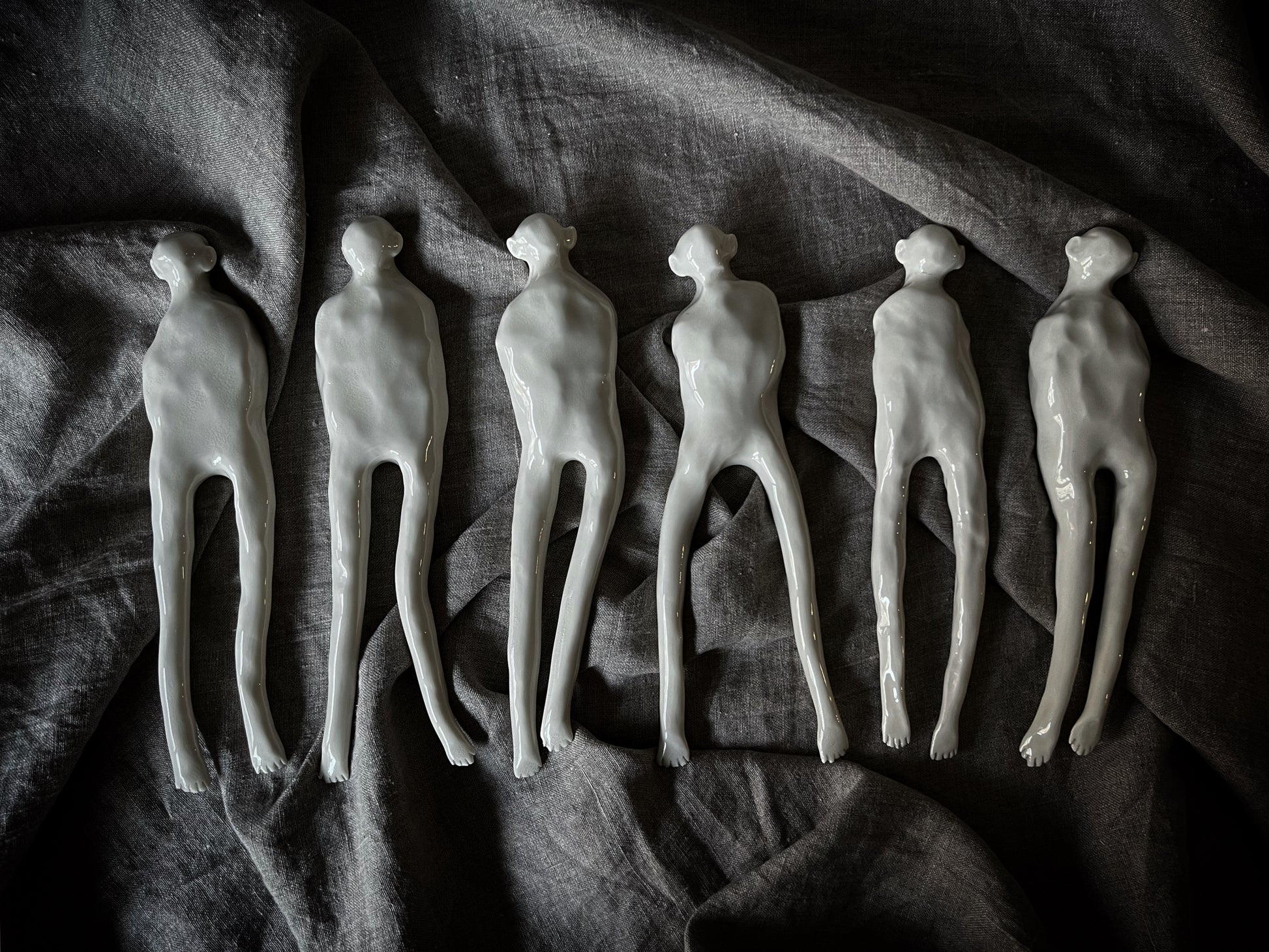 Väggskulptur i porslin med blank glasyr. De är alla skulpterad för hand & med sina varierande rörelser & svängningar får de olika uttryck & karaktär.
