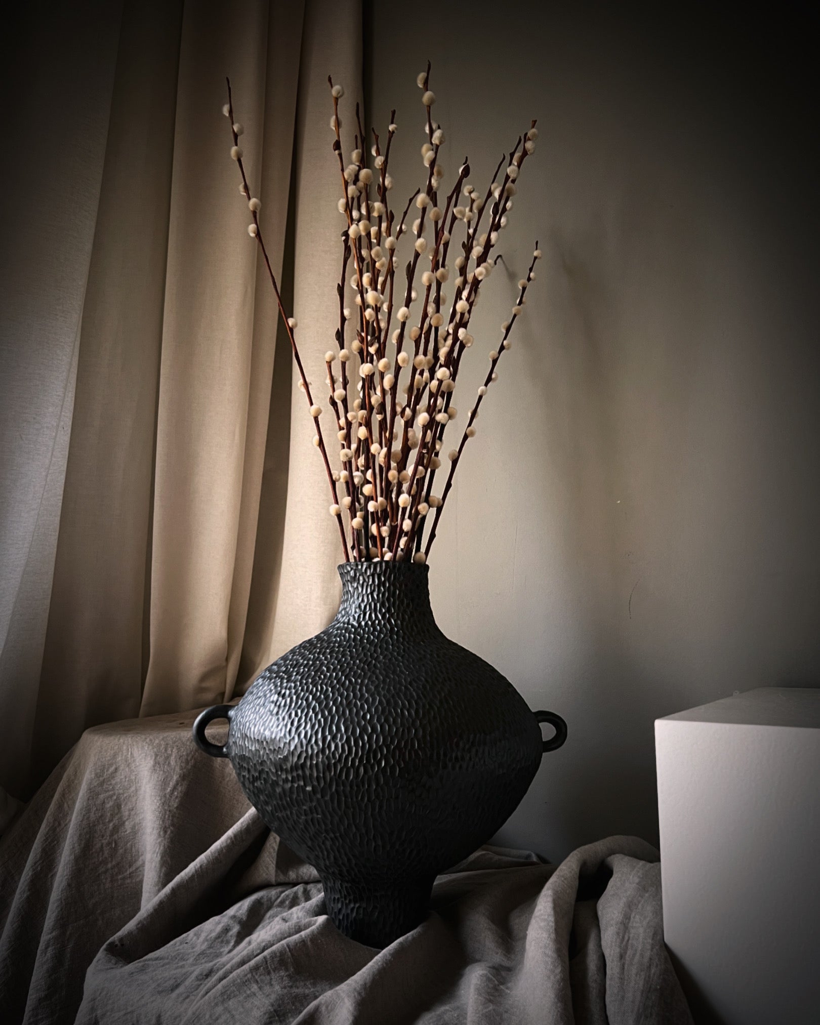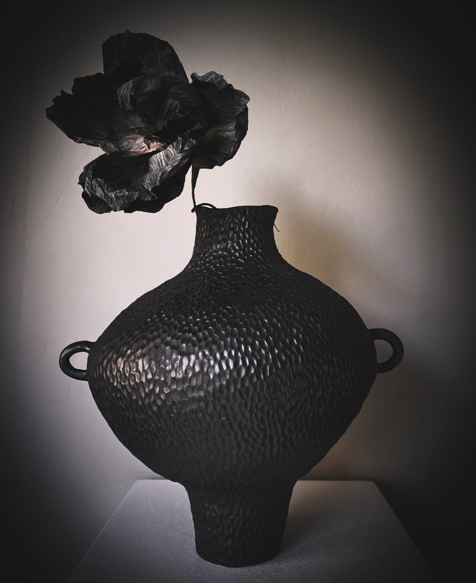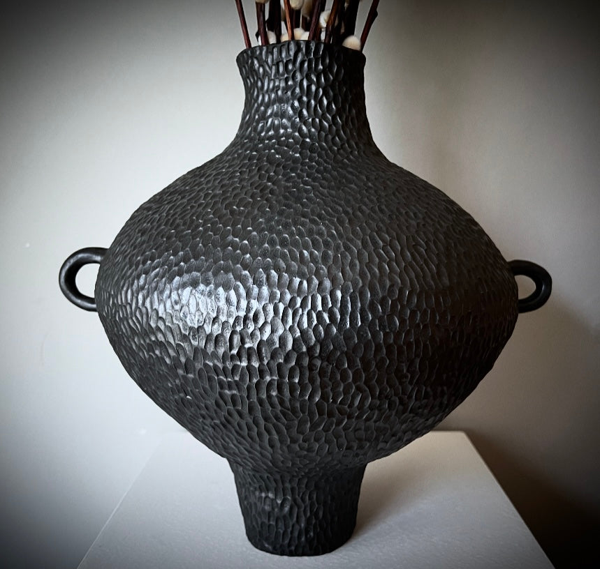 Stor vas, byggd för hand stengodslera. Oregelbunden bubblig form, karvad struktur, svart sidenmatt yta. Höjd 35 cm.