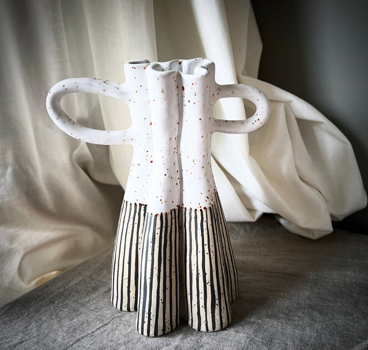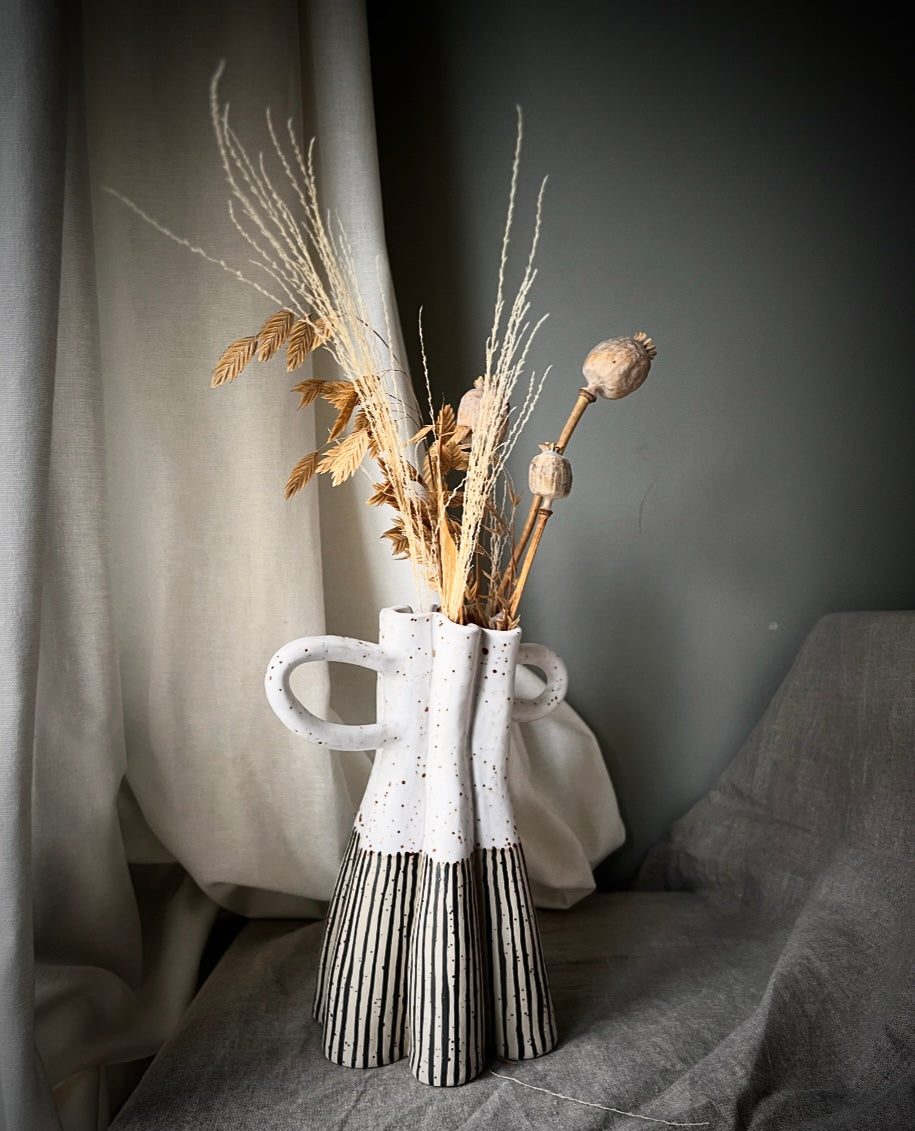 Vas i stengods med vit sidenmatt topp & handmålade ränder.